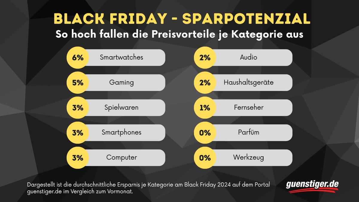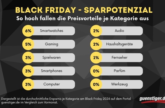 Laut Auswertung gab es spürbare Unterschiede bei den durchschnittlichen Preisnachlässen je Warengruppe. Am meisten sparen konnten Käufer bei Smartwatches (6 Prozent) und Gaming-Produkten (5 Prozent). Smartphones, Computerartikel und Spielwaren lagen jeweils bei 3 Prozent, Haushalts- und Audiogeräte bei 2 Prozent, Fernseher bei 1 Prozent. Parfüms und Werkzeuge boten hingegen gar keine Preisvorteile.