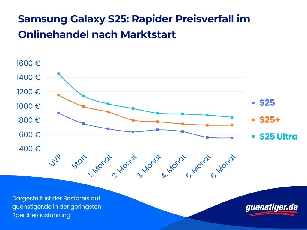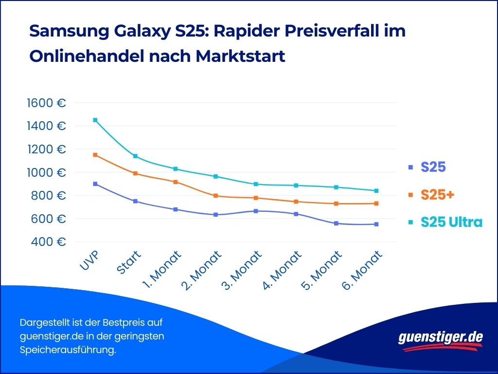 Das Basismodell Galaxy S25 mit 128 GB kostete laut UVP 899 Euro, wurde aber auf guenstiger.de bereits zum Marktstart für 750 Euro angeboten (–17 Prozent). Nach einem Monat fiel der Preis um weitere sieben Prozentpunkte auf 679 Euro. Zwei Monate nach Marktstart lag er sogar 29 Prozent unter der UVP (265 Euro weniger).