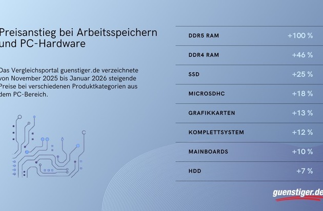 Für die Untersuchung hat guenstiger.de die Preisdaten Tausender Produkte und die Entwicklung der niedrigsten Tagespreise bei über 2.000 Onlinehändlern analysiert. Das Ergebnis: Der Durchschnittspreis für DDR5 RAM lag im Januar 2026 100 Prozent höher als im November 2025. Ebenfalls betroffen: DDR4 RAM (+46 Prozent) und selbst der seit Jahren zurückgezogene DDR3 RAM verteuerte sich um 28 Prozent.