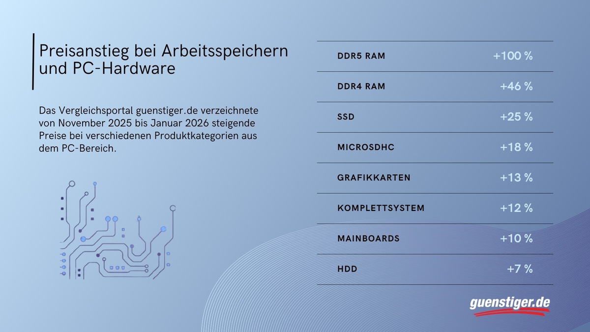 Der Trend rasant steigender Preise für Arbeitsspeicher beschleunigt sich weiter – mit spürbaren Folgen für zahlreiche Technikbereiche. Besonders betroffen sind Nutzer, die auf moderne RAM-Technik setzen. Eine aktuelle Auswertung des Vergleichsportals guenstiger.de belegt: Im Zeitraum von November 2025 bis Januar 2026 verdoppelte sich der Durchschnittspreis für DDR5 RAM. Auswirkungen des Preisschubs zeigen sich außerdem bei älteren Speicherlösungen und weiterer Hardware wie Mainboards, Grafikkarten und SSDs.