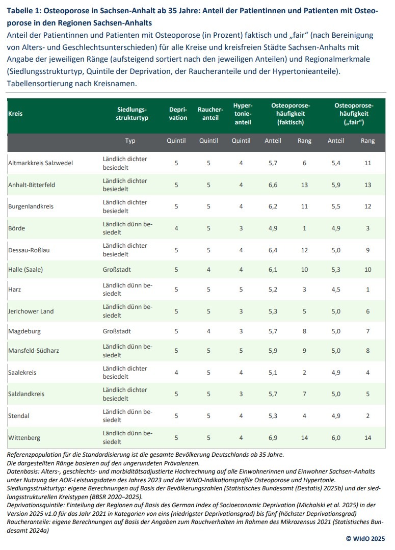 Innerhalb von Sachsen-Anhalt variiert der Anteil von Osteoporose-Erkrankten zwischen 4,9 und 6,9 Prozent (Tabelle 1). Vor allem die Landkreise Wittenberg, Anhalt-Bitterfeld, Dessau-Roßlau, Burgenlandkreis und Halle (Saale) sind betroffen. Hier liegt der Anteil jeweils über 6 Prozent und somit über dem Landesdurchschnitt. Wittenberg, Anhalt-Bitterfeld und Dessau-Roßlau finden sich zudem unter den TOP 10 der bundesweit 400 Kreise mit den höchsten Anteilen. Der Landkreis mit dem geringsten Anteil ist Börde mit 4,9 Prozent. Betrachtet man bundesweit nur die kreisfreien Städte unter 500.000 Einwohnern, finden sich zudem Halle (Saale) mit 6,1 Prozent und Magdeburg mit 5,7 Prozent sogar auf Platz eins und zwei.