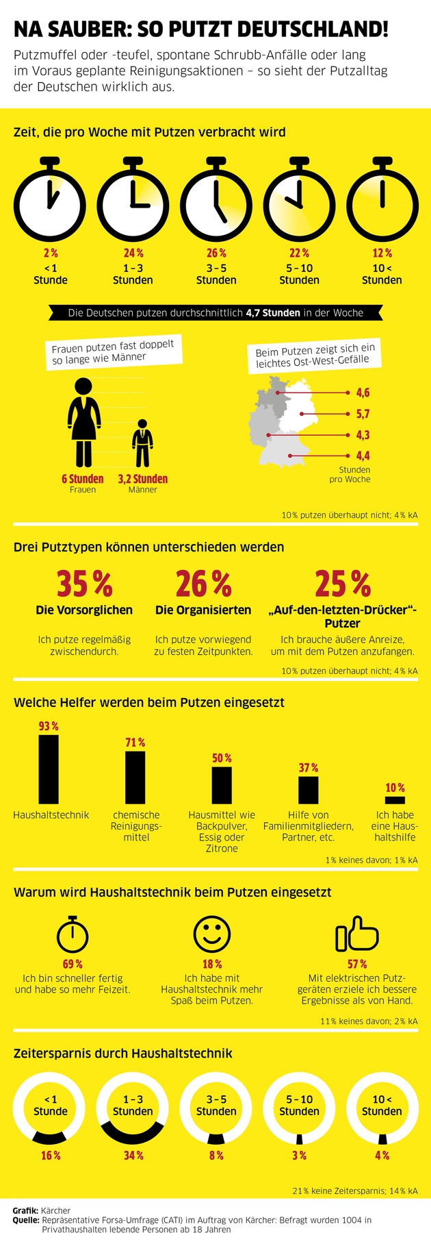 Ziel der Untersuchung war es, dem Putzalltag der Deutschen auf den Grund zu gehen: Wie viel Zeit verbringen sie in der Woche durchschnittlich damit, die Wohnung auf Hochglanz zu bringen? Und wer macht wann, mit welchen Helfern sauber? Die Studie wurde von Kärcher, dem weltweit führenden Hersteller für Reinigungstechnik in Auftrag gegeben. Das Unternehmen bietet mit Hochdruckreinigern, Saugern und Dampfreinigern, Pumpen für Haus und Garten, Kehr- und Scheuersaugmaschinen, Kfz-Waschanlagen, Reinigungsmitteln, Trockeneis-Strahlgeräten, Trink- und Abwasseraufbereitungsanlagen und Wasserspendern zahlreiche Problemlösungen an.