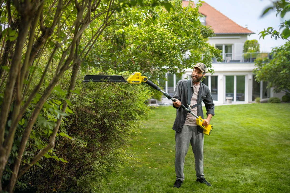 Hohe und breite Hecken oder Sträucher sind nicht nur ein guter Sichtschutz, sondern werten einen Garten auch optisch auf. Die Pflege ist aber oftmals eine Herausforderung, insbesondere wenn hochgelegene Zweige in Form gebracht werden müssen. Rück- und Formschnitte können mit der richtigen Hilfe aber auch sicher und bequem vom Boden aus erledigt werden: Mit der Teleskop-Heckenschere PHG 2-18 hat Kärcher jetzt sein Sortiment der Heckenscheren überarbeitet. Dank eines leistungsstarken 18-V-Akkus, dem geringen Gewicht sowie einem abwinkelbaren Schneidkopf erfolgen Schnittarbeiten künftig noch komfortabler.