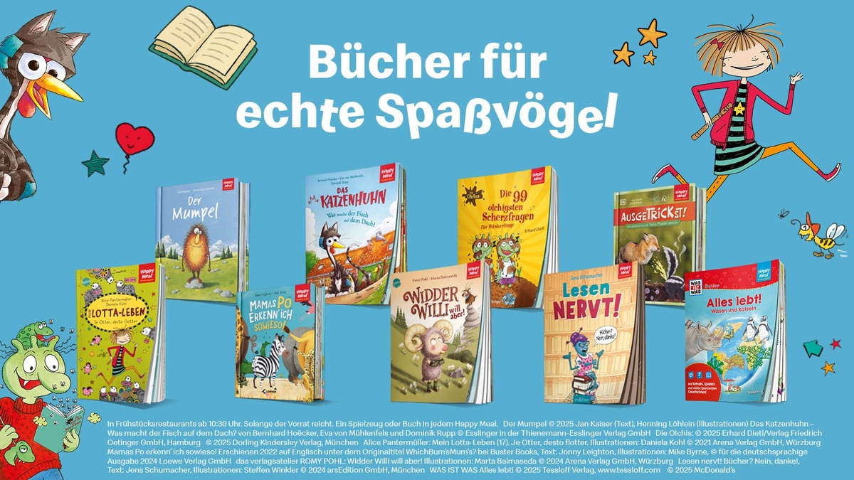 Die neuen Recyclingbücher im Happy Meal® sind: "Das Katzenhuhn" (Bernhard Hoëcker, Eva Mühlenfels & Dominik Rupp), "Der Mumpel" (Jan Kaiser & Henning Löhlein ), "Die 99 olchigsten Scherzfragen für Stinkerlinge" (Erhard Dietl), "Ausgetrickst! Wie einfallsreich sich Tiere & Pflanzen schützen" (Josette Reeves & Asia Orlando), "Mein Lotta-Leben - Je Otter, desto flotter" (Alice Pantermüller & Daniela Kohl), "Mamas Po erkenn ich sowieso!" (Jonny Leighton & Mike Byrne), "Widder Willi will aber!" (Romy Pohl & Marta Balmaseda) und "Lesen nervt!" (Jens Schumacher).