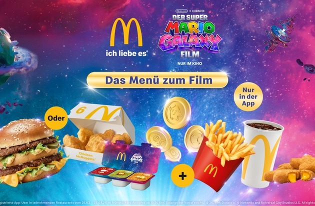 McDonald's startet eine weitere popkulturelle Partnerschaft - mit Nintendo und Illumination's Der Super Mario Galaxy Film. Die Marke positioniert sich dadurch erneut als Treffpunkt für Familien und schafft mit dem Happy Meal® zum Super Mario Film und einem Menü zum Super Mario Film für Erwachsene ein generationenübergreifendes Erlebnis. Rechtzeitig zum weltweiten Kinostart am 01.04. bringt McDonald's Deutschland brandneue Produkt-Highlights auf den Markt. Ab dem 25.03. sind sie für rund vier Wochen erhältlich.