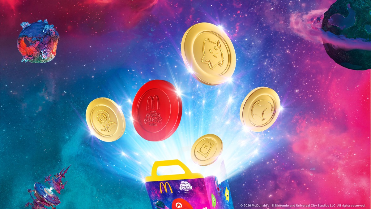 Um Fans noch tiefer in das Abenteuer eintauchen zu lassen, enthält jedes Menü zum Super Mario Film zudem eine von vier goldenen Sammlermünzen. Jede Münze zeigt ein ikonisches Element aus Nintendo und Illumination's Der Super Mario Galaxy Film: Yoshis Ei, einen Luma, die Feuerblume oder Rosalinas Buch. Gesteigert wird der Sammelspaß bei McDonald's mit einer Besonderheit: fünf Mal werden deutschlandweit anstelle einer goldenen Münze eine rote Münze in den Menüs zu finden sein. Wer eine dieser roten Münzen findet, gewinnt eine 7-tägige Reise für 4 Personen ins Universal Orlando Resort in Florida.