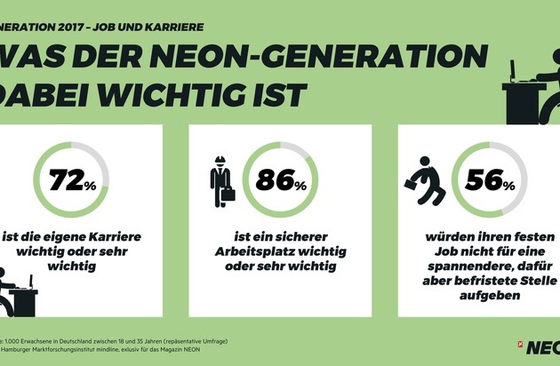 Hamburg, 12. Juni 2017 - Für die jungen Erwachsenen in Deutschland haben die berufliche Laufbahn und Sicherheit im Job oberste Priorität bei ihrer Lebensplanung. Fast drei Viertel der 18- bis 35-Jährigen (72 Prozent) ist die eigene Karriere und für noch deutlich mehr ein sicherer Arbeitsplatz (86 Prozent) wichtig oder sehr wichtig. Das ergab die repräsentative Umfrage "Generation 2017", die das Hamburger Markforschungsinstitut mindline exklusiv für das Magazin NEON unter 1.000 Personen dieser Altersgruppe durchgeführt hat. Im Vergleich mit der letzten NEON-Studie aus dem Jahr 2014 steht heute der berufliche Erfolg damit wieder sehr viel stärker im Fokus. Damals lag beispielsweise der Spaß beim Job an erster Stelle.