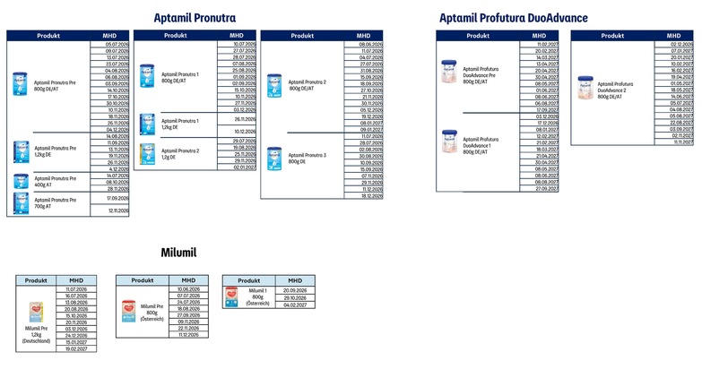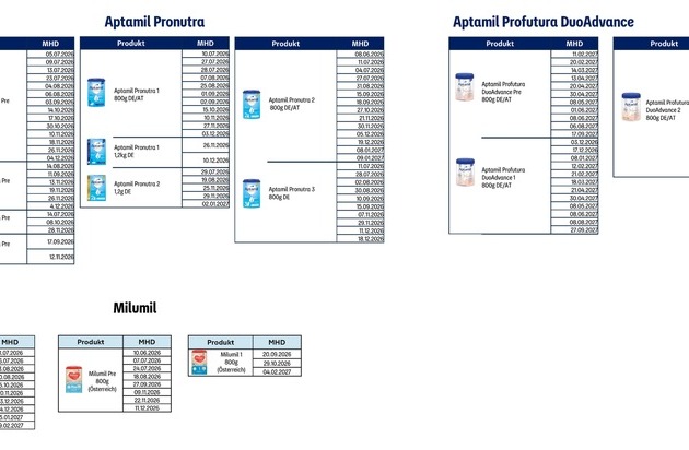 Auf den jeweiligen Markenwebsites aptaclub.de und milupa.de haben Eltern die Möglichkeit zu überprüfen, ob ihr Mindesthaltbarkeitsdatum betroffen ist. Darüber hinaus können sie sich jederzeit an den Verbraucherservice wenden: