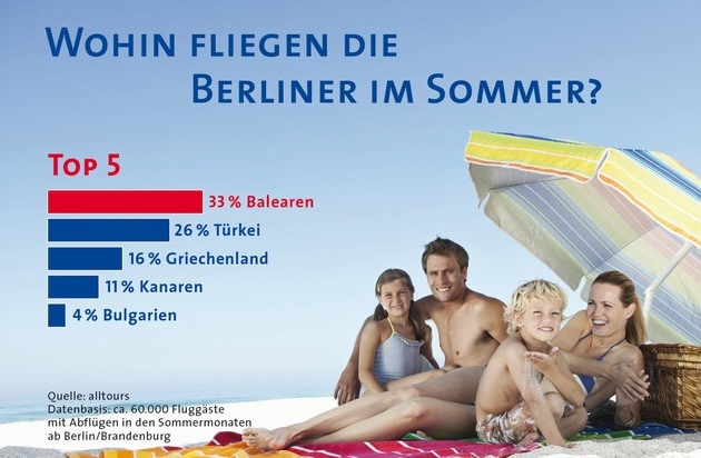 Untersuchungsmethodik: alltours hat rund 60.000 Buchungen für die Untersuchung ausgewertet. Dabei handelt es sich um Urlaubsflugreisen, die bis Anfang Juli gebucht wurden und die in den Sommermonaten, also in den Hauptferienzeiten, angetreten werden. Bei der Untersuchung wurden die beiden Berliner Flughäfen Schönefeld und Tegel berücksichtigt, von denen alltours Gäste in den Urlaub fliegen.