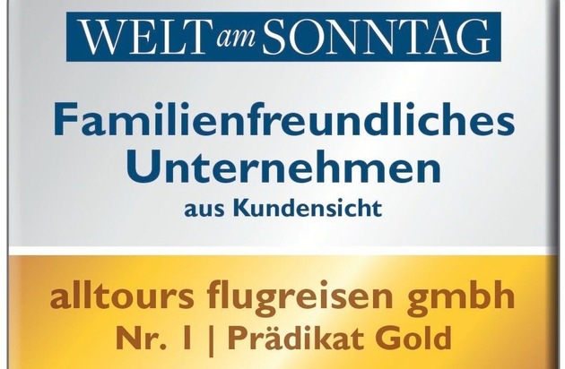 Zum dritten Mal hat die Unternehmensberatung ServiceValue rund 350.000 Personen zur Familienfreundlichkeit von Unternehmen befragt. In der Kategorie "Reiseveranstalter" landete alltours flugreisen - wie bereits im vergangenen Jahr - auf dem ersten Platz und ist somit der familienfreundlichste deutsche Reiseveranstalter. Ebenso wurden die alltours Reisecenter mit einem Goldrang in Familienfreundlichkeit bedacht.