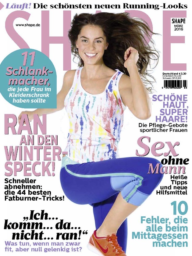 Der Frühlingsanfang naht und mit den steigenden Temperaturen wird es endlich wieder Zeit, die Laufschuhe auszupacken und den Fettpolstern davon zu joggen: SHAPE (3/2016, EVT. 3.2.) präsentiert in der aktuellen Ausgabe 44 Tricks, die unerwünschte Kilos schneller purzeln lassen und den Weg zum Idealgewicht ebnen - vom Ausdauersport und Krafttraining bis zu schmackhaften Schlankmachern.