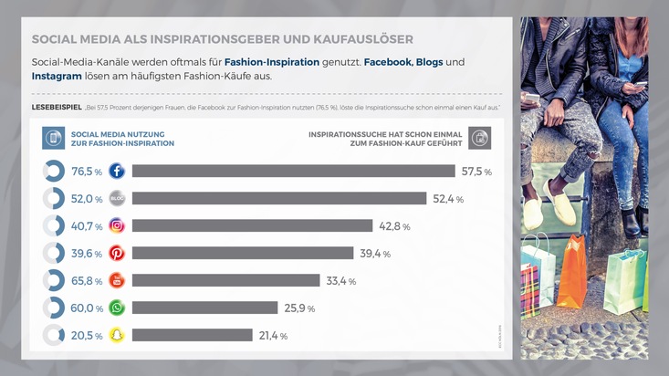 Nicht nur der Fernseher, auch die sozialen Medien haben einen festen Platz als Inspirationsquelle. Auch als konkrete Kaufauslöser werden sie immer wichtiger. Allen voran Facebook, Blogs und Instagram: Rund 77 Prozent der Frauen lassen sich auf Facebook in Sachen Mode inspirieren. Und: Für rund 58 Prozent der Facebook-Nutzerinnen war dies schon einmal der Impuls für einen Kauf. Fashion-Blogs sind inzwischen ähnlich relevant: Rund 52 Prozent der befragten Shopperinnen haben schon einmal etwas gekauft, das sie zuvor in einem Blog-Beitrag entdeckt haben. Die Fotoplattform Instagram liegt mit knapp 43 Prozent auch unter den Top 3-Kaufauslösern der Social Media-Kanäle.