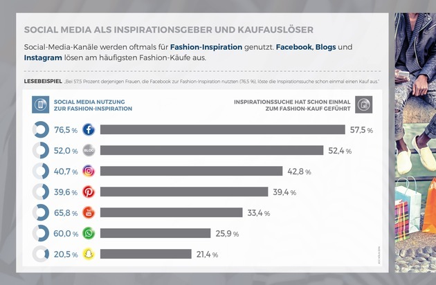 Nicht nur der Fernseher, auch die sozialen Medien haben einen festen Platz als Inspirationsquelle. Auch als konkrete Kaufauslöser werden sie immer wichtiger. Allen voran Facebook, Blogs und Instagram: Rund 77 Prozent der Frauen lassen sich auf Facebook in Sachen Mode inspirieren. Und: Für rund 58 Prozent der Facebook-Nutzerinnen war dies schon einmal der Impuls für einen Kauf. Fashion-Blogs sind inzwischen ähnlich relevant: Rund 52 Prozent der befragten Shopperinnen haben schon einmal etwas gekauft, das sie zuvor in einem Blog-Beitrag entdeckt haben. Die Fotoplattform Instagram liegt mit knapp 43 Prozent auch unter den Top 3-Kaufauslösern der Social Media-Kanäle.
