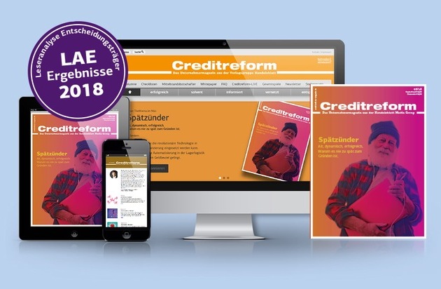 Das Unternehmermagazin Creditreform aus der Handelsblatt Media Group verzeichnet den stärksten Reichweitenzuwachs unter den Monatsmagazinen bei der Reichweitenstudie LAE 2018 - "Leseranalyse Entscheidungsträger in Wirtschaft und Verwaltung" - und beweist sich als zentraler Titel für die Mediaplanung im Mittelstand.