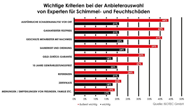 Die Deutschen haben ganz konkrete Vorstellungen, was sie von einem guten Handwerksbetrieb erwarten. Dies geht aus einer repräsentativen Befragung des Meinungsforschungsinstituts "Heute und Morgen" hervor, die im Auftrag des Sanierungsunternehmens ISOTEC durchgeführt wurde. Sehr wichtig ist 44% der Befragten eine konkrete Schadenanalyse vor Ort sowie eine ausführliche Beratung - und eben keine Ferndiagnose oder allgemeine Standardaussagen. Da die Angst vor hohen Kosten für die professionelle Sanierung bei den Betroffenen immer mitschwingt, möchten 42% unbedingt einen garantierten Festpreis erhalten, der auch der tatsächliche Endpreis ist, bevor sie sich für einen Anbieter entscheiden.