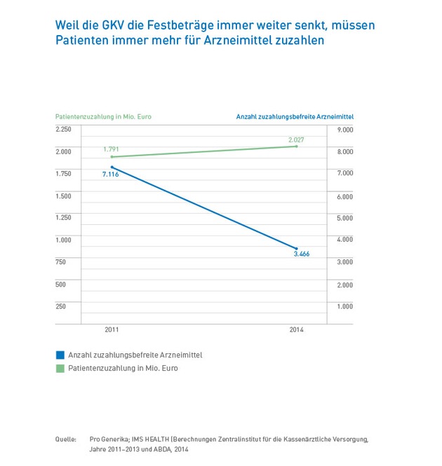 Im Jahr 2014 hat die GKV durch Zuzahlungen für Arzneimittel über 2 Mrd. Euro eingenommen. Das entspricht in etwa dem gesamten Netto-Umsatz der Generikaindustrie, die allerdings dafür 76 % der gesamten Arzneimittelversorgung in Deutschland leisten muss.