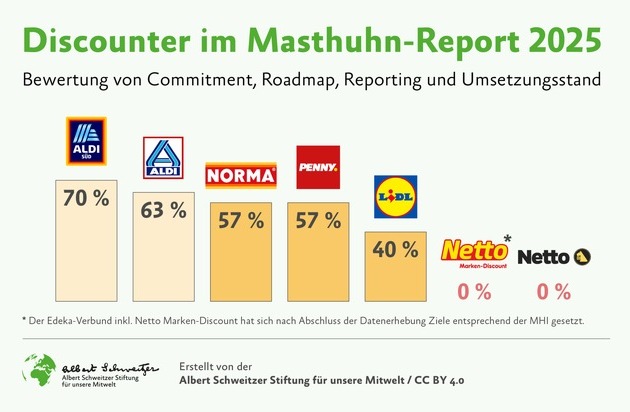 Unter den Discountern führt Aldi Süd mit 70 % das Feld an, dicht gefolgt von Aldi Nord (63 %) und Penny (57 %). Lidl (40 %) hat sich erst nach Ende des Erhebungszeitraums zu den Kriterien der Masthuhn-Initiative bekannt, signalisiert mit einer ambitionierten Roadmap und konkreten Zielen jedoch einen klaren Kurswechsel.