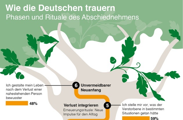 Auch der unvermeidbare Neuanfang wird durch die Rituale einfacher, weil die Hinterbliebenen so die eigenen Ziele und Perspektiven wieder in den Vordergrund rücken können, ohne ein schlechtes Gewissen zu haben. Und aus der individuellen Krise gehen sie gestärkt hervor. So geben 48 Prozent der Befragten an, ihr Leben nach der Verarbeitung des Trauerfalls insgesamt bewusster zu gestalten.