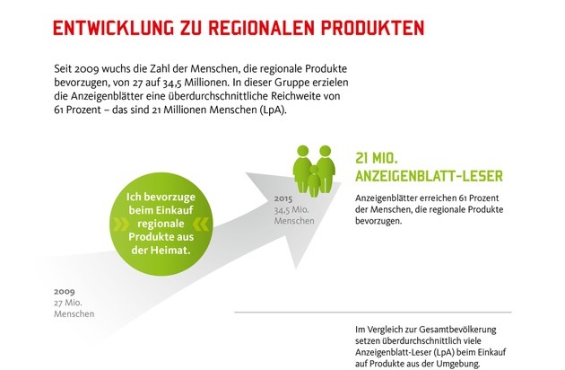 Mehr als 56 Prozent der Anzeigenblatt-Leser bevorzugen beim Einkauf regionale Produkte. Damit ist die Vorliebe für Lebensmittel aus der Heimat bei Anzeigenblatt-Lesern (Leser pro Ausgabe) deutlich stärker vertreten als in der deutschsprachigen Gesamtbevölkerung ab 14 Jahre mit 50 Prozent. Doch auch in der Gesamtbevölkerung ist die Anzahl der Käufer, die Produkte aus der Umgebung präferieren, in den letzten Jahren konstant gestiegen: von 27 Millionen Menschen im Jahr 2009 auf 34,5 Millionen im Jahr 2015. Dies belegt die Allensbacher Markt- und Werbeträgeranalyse (AWA) 2015 des Instituts für Demoskopie Allensbach. Der Bundesverband Deutscher Anzeigenblätter veröffentlicht zu den gattungsspezifischen Ergebnissen der Studie in Kürze die Broschüre "Anzeigenblätter in der AWA 2015".