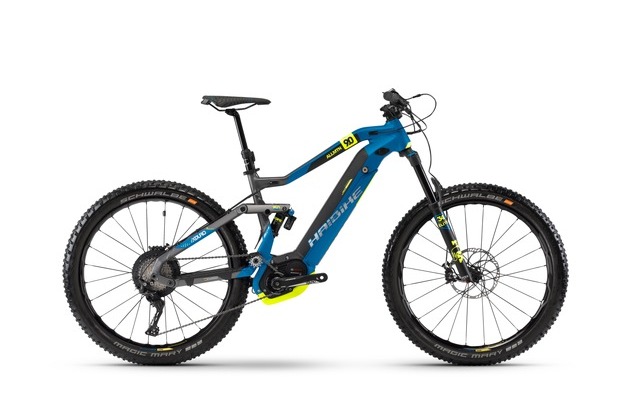 Der Schweinfurter Hersteller Haibike ist Vorreiter in Sachen E-Mountainbike und präsentiert nun seine neueste Ausbaustufe unterstützter MTBs. Optisches Highlight in der vielseitigsten Gattung Allmountain ist das "Xduro Allmtn 9.0" (5.499 Euro) mit neuem Geometriekonzept und 150 mm bzw. 160 mm Federweg. Bergauf lockt das Rad mit Bosch-CX-Mittelmotor und dem neuen Power-Tube-Akku. Letzterer ist durch eine neue Rahmenfertigungstechnik formschlüssig ins Unterrohr integriert. Geschützt wird die Kraftquelle durch eine Kunststoff-Platte. Neu außerdem ist das Modular-Rail-System, das sich zur Montage von Flaschenhalter, Schloss oder Rahmentasche eignet.