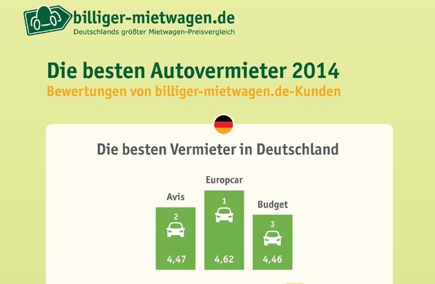 www.billiger-mietwagen.de ist der größte Produkt- und Preisvergleich für Mietwagen in Deutschland. Nutzer sparen bis zu 50 Prozent und profitieren von der transparenten Darstellung der Angebote: Versicherungen und Zusatzleistungen sind auf einen Blick vergleichbar. Kunden können sich von Reisefachleuten über eine kostenlose Infoline beraten lassen. Bis 24 Stunden vor Anmietung ist die Stornierung des Mietwagens kostenfrei. 2014 kürte "FOCUS-MONEY" das Internetportal zum 5. Mal in Folge zum "besten Mietwagenvermittler". Beim "umfangreichsten Test" deutscher Mietwagen-Portale erhielt es von der Deutschen Gesellschaft für Verbraucherstudien (DtGV) und N24 in der Kategorie "Transparenz" die Bestnote 1,3 und wurde Gesamtsieger aus 14 Portalen. Bei "Service-Champions" erreichte billiger-mietwagen.de unter 7 Mietwagen-Vergleichsportalen Platz 1. TÜV SÜD zeichnete billiger-mietwagen.de 2014 zum 10. Mal in Folge mit dem "s@fer-shopping"-Zertifikat für geprüfte Qualität, Sicherheit und Transparenz aus. Über 180.000 Mietwagen-Kunden bewerten billiger-mietwagen.de durchschnittlich mit 4,5 von 5 Sternen.