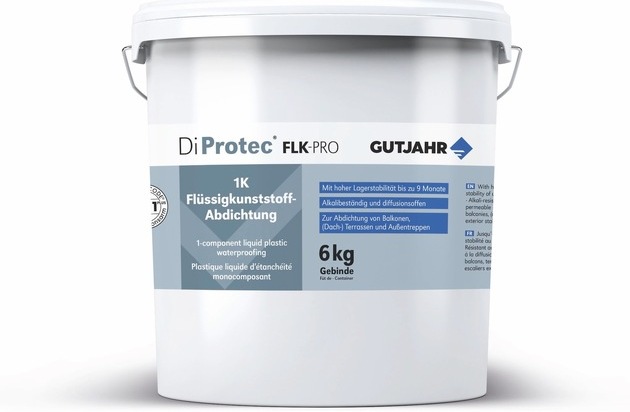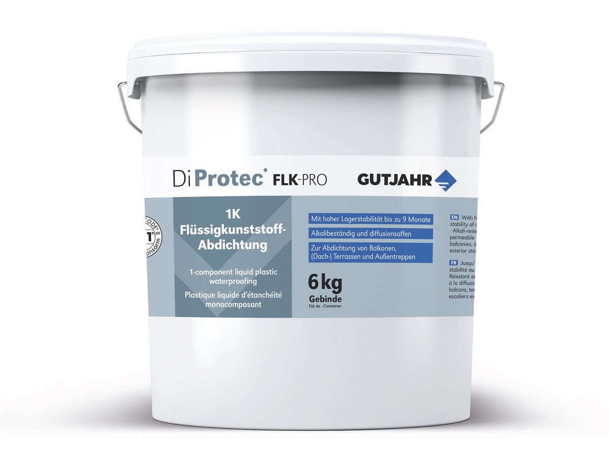 Bickenbach/Bergstraße, 23. April 2026. Gutjahr hat sein Abdichtungssystem weiterentwickelt. DiProtec FLK-PRO ist jetzt 1-komponentig und hat einen deutlich größeren Einsatzbereich als vorher: Die neue Abdichtung eignet sich als Flächenabdichtung ebenso wie für Details und Anschlüsse an bestehende Abdichtungen. Gleichzeitig vereinfacht sie die Verarbeitung auf der Baustelle, weil sie direkt aus dem Eimer aufgetragen werden kann. Das Gebinde lässt sich nach den Arbeiten einfach verschließen und später wieder verwenden – bis zu neun Monate lang.
