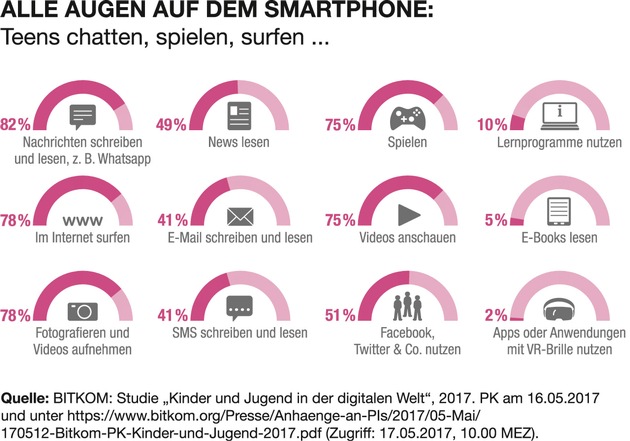 Zwei Stunden fernsehen, zwei Stunden gamen, in der Schule mit PC und Tablet arbeiten, für die Hausaufgaben im Internet surfen - und den Rest des Tages bloß nicht das Smartphone aus den Augen lassen: Kinder und Jugendliche erlauben ihrem Blick immer weniger, draußen bei Tageslicht für längere Zeit in die Ferne zu schweifen. Sie starren im Nahsichtmodus auf Bildschirm und Display - und das quasi ohne mit der Wimper zu zucken. Denn wer sich auf einen Punkt konzentriert, blinzelt nur ein- bis zweimal pro Minute statt mindestens zehnmal so oft. Die Folge sind trockene Augen - eine Einladung für Krankheitserreger. Auch blaues Licht, das von Displays ausgeht, kann zu Entzündungen von Binde- und Hornhaut sowie zu Schädigungen von Augenlinse und Netzhaut führen.2