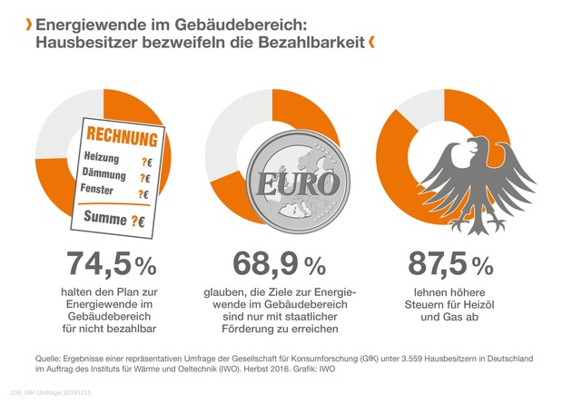 In Auftrag gegeben wurde die GfK-Befragung unter rund 3.500 Besitzern von Ein- und Zweifamilienhäusern vom Institut für Wärme und Oeltechnik (IWO). Dessen Geschäftsführer Adrian Willig weist darauf hin, dass die Kosten der Energiewende im Gebäudebereich bislang von der Politik vernachlässigt werden: "Ein relevanter Beitrag des Gebäudesektors für den Klimaschutz ist aber nur dann realistisch, wenn die dafür notwendigen Maßnahmen auch für die Menschen bezahlbar sind. Deswegen ist ein technologieoffener Wettbewerb um die besten und günstigsten Lösungen unverzichtbar."