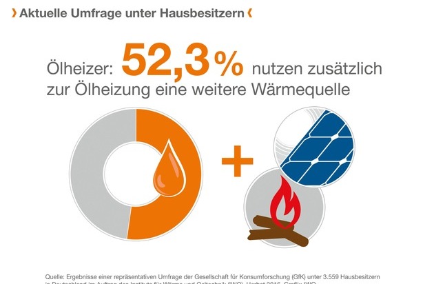 Hausbesitzer mit einer Ölheizung setzen besonders oft zusätzlich auch auf erneuerbare Energien. Das zeigt eine GfK-Umfrage unter mehr als 3.500 Hauseigentümern in Deutschland. Demnach nutzen 52,3 Prozent der ölbeheizten Haushalte eine weitere Wärmequelle. Am häufigsten bilden Holzkaminöfen und Solarwärme-Anlagen das zweite Standbein. Mit der Ölheizung als Basis der Wärmeversorgung sind 94 Prozent der befragten Ölheizungsbesitzer zufrieden oder sehr zufrieden. In den vergangenen Jahren wurden bei der Heizungsmodernisierung überwiegend effiziente Brennwertheizungen eingebaut. Ausschlaggebend für den Verbleib bei der Ölheizung ist laut Umfrage für viele Hausbesitzer unter anderem das gute Kosten-Nutzenverhältnis.