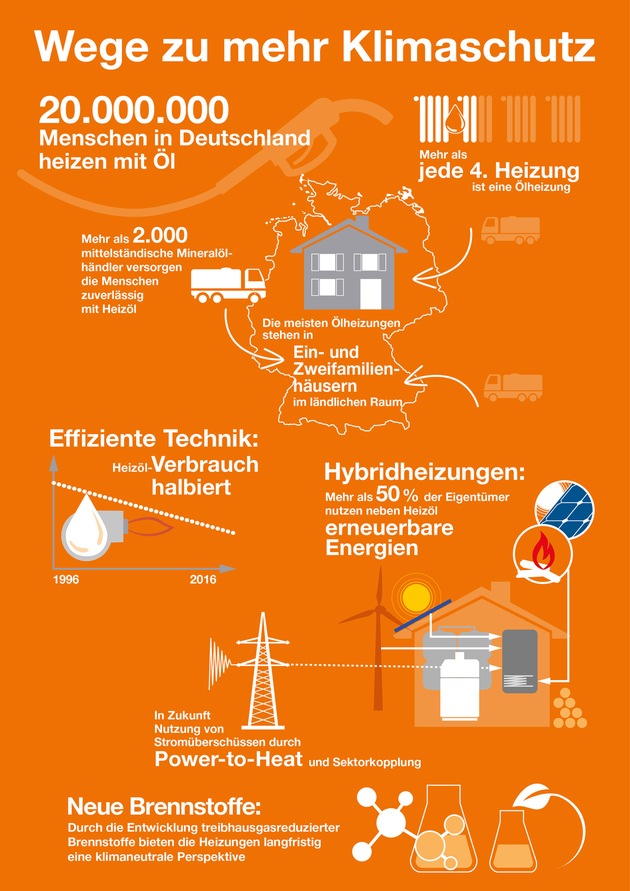 "Öl-Brennwerttechnik bietet schon heute ein Höchstmaß an Effizienz und ist idealer Partner für erneuerbare Energien. Bereits mehr als die Hälfte aller Ölheizer in Deutschland setzt bereits zusätzlich auf erneuerbare Heizenergien wie Holz oder Solarthermie", berichtet Willig. "Künftig könnten solche Hybrid-Heizsysteme dank Power-to-Heat auch überschüssigen Ökostrom in die Wärmeversorgung einbinden. Langfristig eröffnen Öl-Brennwertheizungen durch die Nutzung synthetischer Brennstoffe eine treibhausgasreduzierte oder sogar klimaneutrale Perspektive." Daher, so Willig, werden flüssige Energieträger auch im Energiemix des Jahres 2050 eine wichtige Rolle spielen.