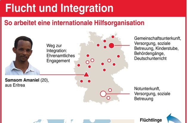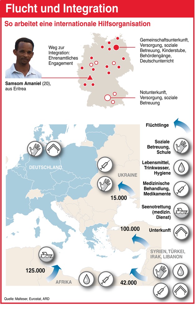 Voraussichtlich 450.000 Flüchtlinge suchen in Deutschland in diesem Jahr Asyl. Krieg, Armut und Verfolgung treiben sie aus ihrer Heimat. Internationale Hilfsorganisationen, wie z. B. die Malteser, verhindern auf der Flucht Schlimmeres und sorgen in Deutschland für Betreuung und Integration. In den Herkunftsländern engagieren sie sich für die Hilfe zur Selbsthilfe.