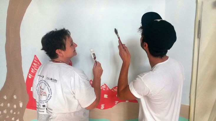 Mehr als 1.500 Mitarbeiter aus 52 Unternehmen haben beim Malteser Social Day für den guten Zweck gearbeitet. Engagiert waren sie in rund 130 Maßnahmen für Flüchtlinge, demenziell Erkrankte, Menschen mit Behinderung, Obdachlose oder Kinder- und Jugendliche. So half Nadine Hennig mit ihren Kolleginnen und Kollegen, dass eine Unterkunft für Flüchtlinge mit Wandbildern wohnlicher wurde. Das Besondere: Die Bankangestellten und die Bewohner der Unterkunft arbeiteten zusammen, erzählten von sich und aßen miteinander die von den Bewohnern zubereiteten Speisen - ein deutliches "Welcome" beider Seiten. "Wir wurden herzlich aufgenommen und haben uns auf Englisch und mit Händen und Füßen verständigt", beschrieb die 33-jährige Sachbearbeiterin der Commerzbank-Filiale Mainz das Miteinander.