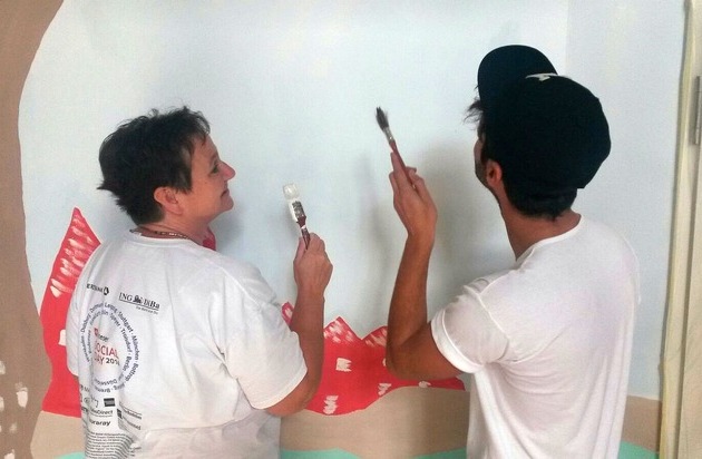 Mehr als 1.500 Mitarbeiter aus 52 Unternehmen haben beim Malteser Social Day für den guten Zweck gearbeitet. Engagiert waren sie in rund 130 Maßnahmen für Flüchtlinge, demenziell Erkrankte, Menschen mit Behinderung, Obdachlose oder Kinder- und Jugendliche. So half Nadine Hennig mit ihren Kolleginnen und Kollegen, dass eine Unterkunft für Flüchtlinge mit Wandbildern wohnlicher wurde. Das Besondere: Die Bankangestellten und die Bewohner der Unterkunft arbeiteten zusammen, erzählten von sich und aßen miteinander die von den Bewohnern zubereiteten Speisen - ein deutliches "Welcome" beider Seiten. "Wir wurden herzlich aufgenommen und haben uns auf Englisch und mit Händen und Füßen verständigt", beschrieb die 33-jährige Sachbearbeiterin der Commerzbank-Filiale Mainz das Miteinander.