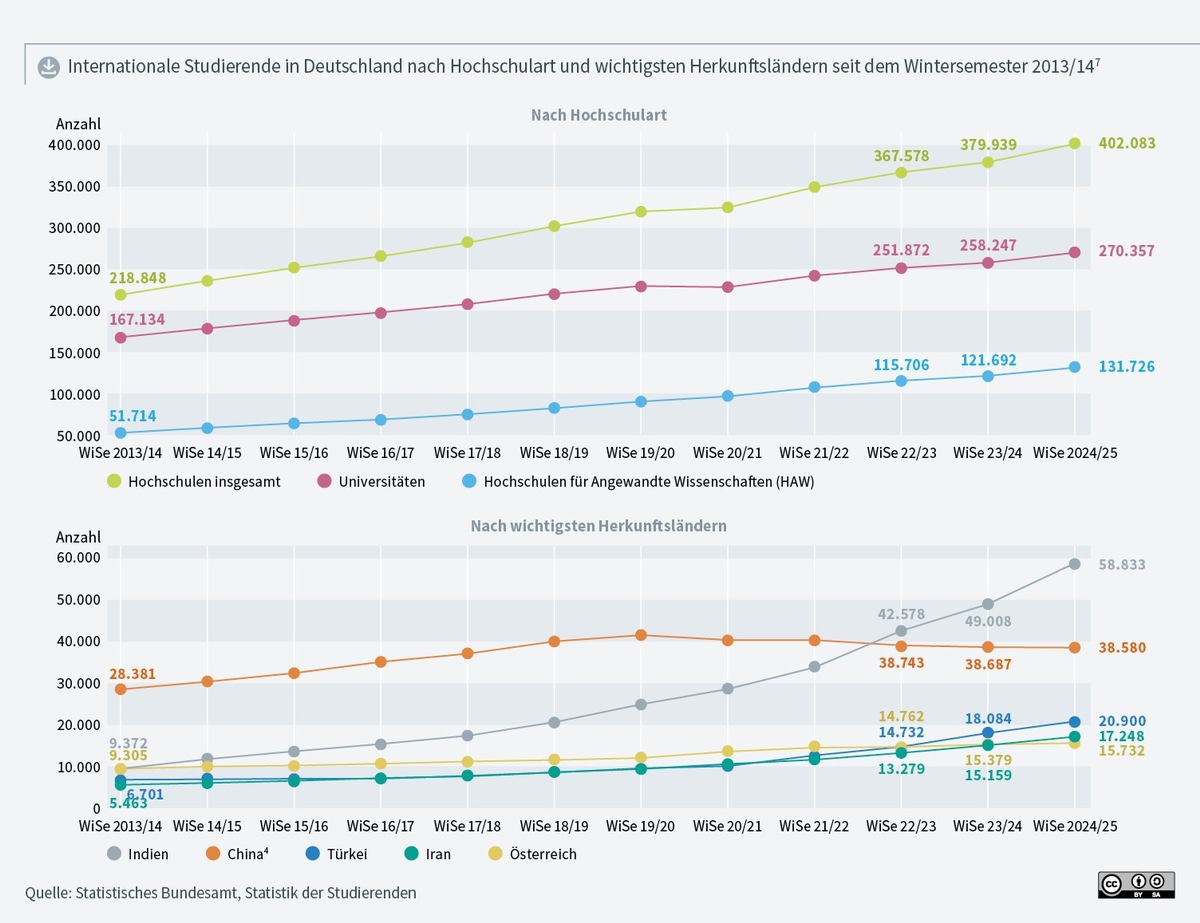 Laut Wissenschaft weltoffen 2025 waren im letzten Wintersemester rund 402.000 internationale Studierende und Promovierende an deutschen Hochschulen eingeschrieben. Die Zahl der internationalen Studienanfängerinnen und -anfänger erreichte mit 116.600 einen neuen Höchststand.