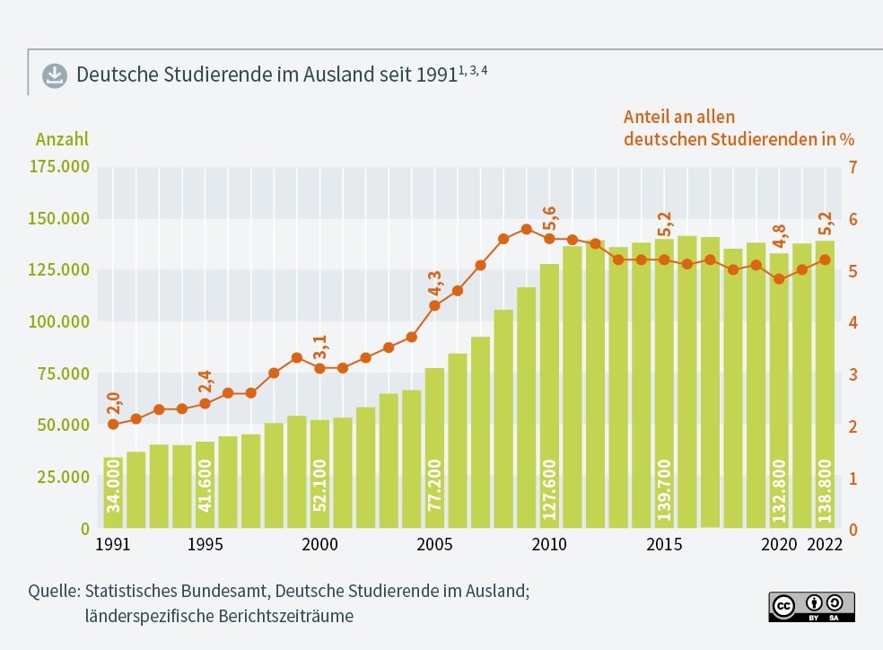 Rund 138.800 deutsche Studierende waren 2022 an Hochschulen im Ausland eingeschrieben. Diese Zahl lag damit leicht über dem Vor-Corona-Niveau von 2019 (137.900). Auch der Anteil der deutschen Auslandsstudierenden an allen Studierenden lag 2022 wieder bei gut fünf Prozent.