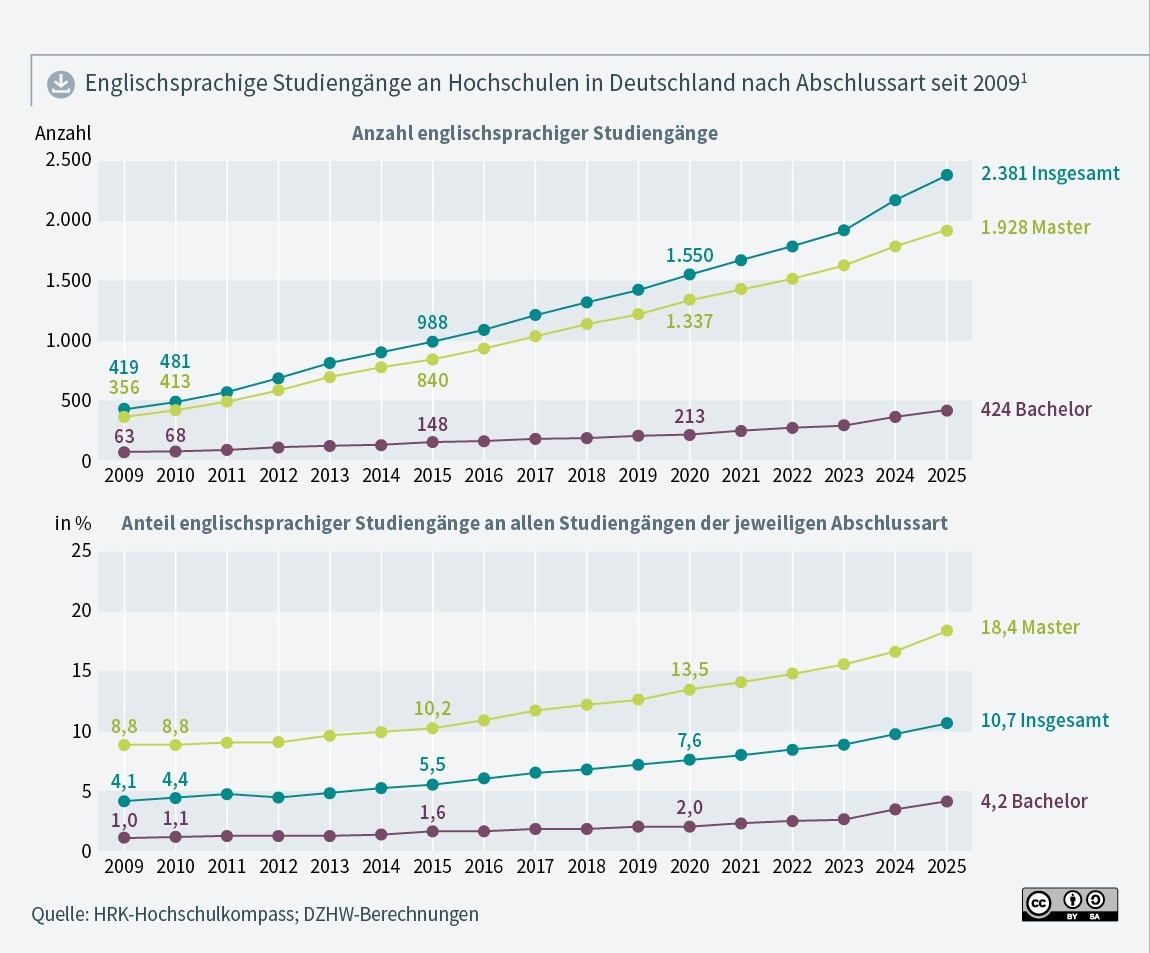 Auch die Zahl der englischsprachigen Studiengänge in Deutschland ist weiter gestiegen: Im Sommer 2025 boten die staatlich anerkannten Hochschulen knapp 2.400 englischsprachige Programme an – darunter rund 420 Bachelor- und 1.930 Masterstudiengänge. Der Anteil englischsprachiger an allen Studiengängen liegt auf Masterniveau damit bei gut 18 Prozent, auf Bachelorniveau waren es lediglich 4 Prozent.