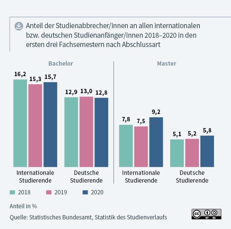 Bezogen auf die ersten drei Studiensemester lag die Abbruchquote internationaler Studienanfängerinnen und Studienanfänger des Jahrgangs 2020 bei 16 Prozent im Bachelor und bei neun Prozent im Master; bei deutschen Studierenden waren es 13 bzw. sechs Prozent. Besonders niedrige Abbruchquoten internationaler Studierender finden sich an Kunst- und Musikhochschulen, vergleichsweise hohe in den Geistes- sowie den Gesundheitswissenschaften.