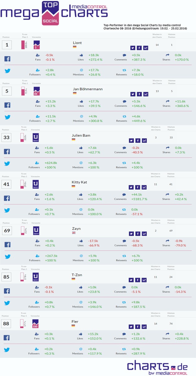 Nationaler Facebook + Twitter-Erfolg ist messbar: media control veröffentlicht die Rangfolge der Musikkünstler mit höchsten Fan- und Interaktionsperformances, erstmals basierend auf den deutschen Nutzerdaten von Facebook und Twitter, für Chartwoche 08 (Erhebungszeitraum: 19.02. - 25.02.2016).
