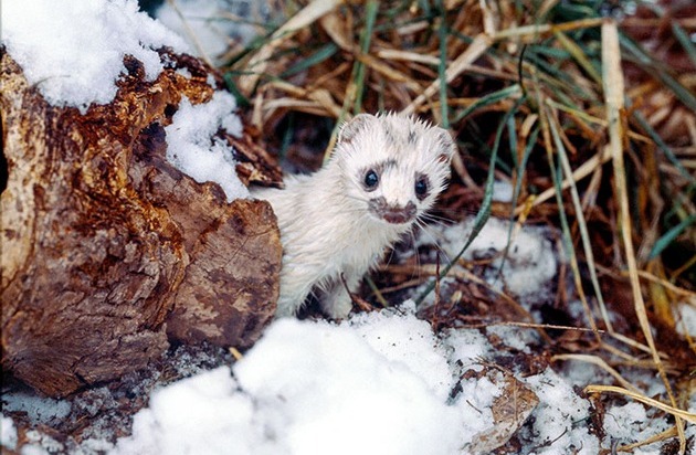 Man könnte sie für zwei völlig verschiedene Tiere halten, aber tatsächlich handelt es sich bei Großem Wiesel und Hermelin (Mustela erminea) um ein und dieselbe Art. Im Sommer trägt es einen braunen Pelz und weißen Bauch (Wiesel), im Winter dagegen wechselt sein Fell und wird mit Ausnahme der charakteristischen schwarzen Schwanzspitze komplett weiß (Hermelin). Eine perfekte Tarnung für den kleinen Jäger, um in der schneebedeckten Winterlandschaft auf die Jagd zu gehen und zugleich von seinen zahlreichen Fressfeinden aus der Luft wie dem Mäusebussard oder dem Uhu nicht so leicht erspäht zu werden. In Regionen, wo der Schnee ausbleibt und die Winter eher mild verlaufen, bleibt das Fell dagegen ganzjährig braun-weiß.