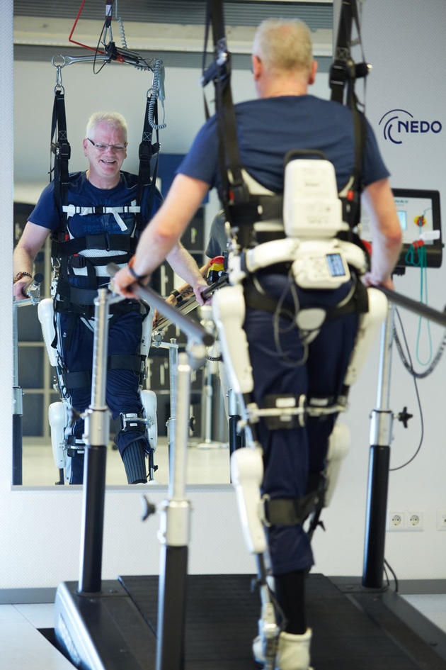 Einen weiteren starken Impuls hat der Versicherte durch ein Lauf-Training mit dem Exoskelett am Berufsgenossenschaftlichen Universitätsklinikum (BGU) Bergmannsheil in Bochum erfahren. Beim Training mit dem Roboteranzug ging Rasche aufrecht auf dem Laufband, über dem sein Körper fixiert war. Das Training funktioniert nur bei Menschen mit inkompletter Querschnittslähmung. Dabei werden Nervenimpulse vom Gehirn des Patienten in Signale umgewandelt, die ein am Exoskelett befestigter Computer empfängt und als Bewegungsbefehle an vier Elektromotoren weitergibt. Diese sind an den Gliedmaßen des Patienten befestigt.