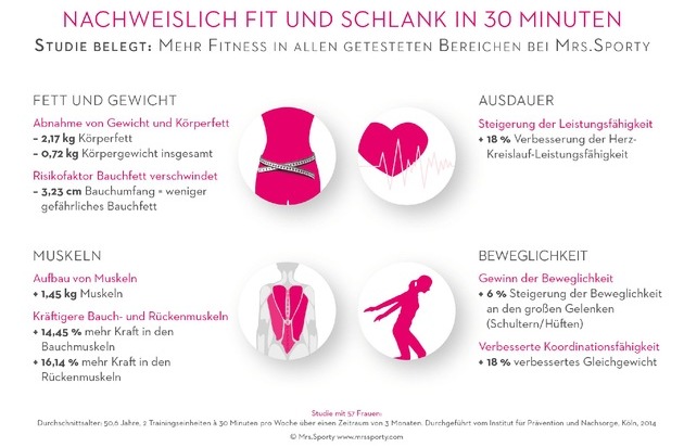 Muskeln auf- und Fett abbauen, schlanker, leistungsfähiger und beweglicher werden - eine aktuelle Studie des Instituts für Prävention und Nachsorge (IPN) in Köln weist nach, dass Frauen diese Ziele mit Mrs.Sporty innerhalb von drei Monaten erreichen. Hinzu kommen weitere positive gesundheitliche Folgen: Die Gefahr von Herz-Kreislauf- und Stoffwechselerkrankungen sinkt, weil das risikoreiche Bauchfett schmilzt. Rücken- und Gelenkprobleme werden durch den Aufbau von Muskeln reduziert.