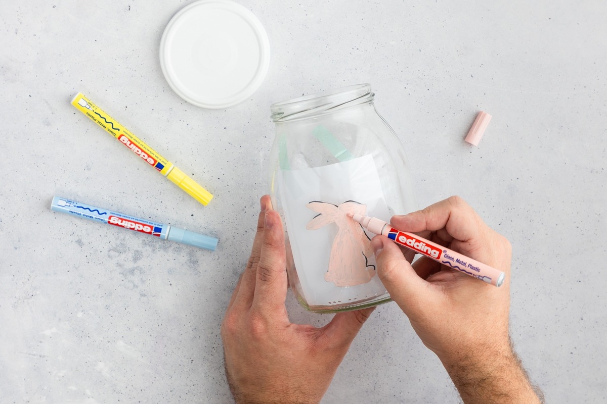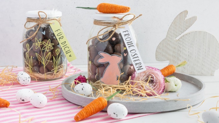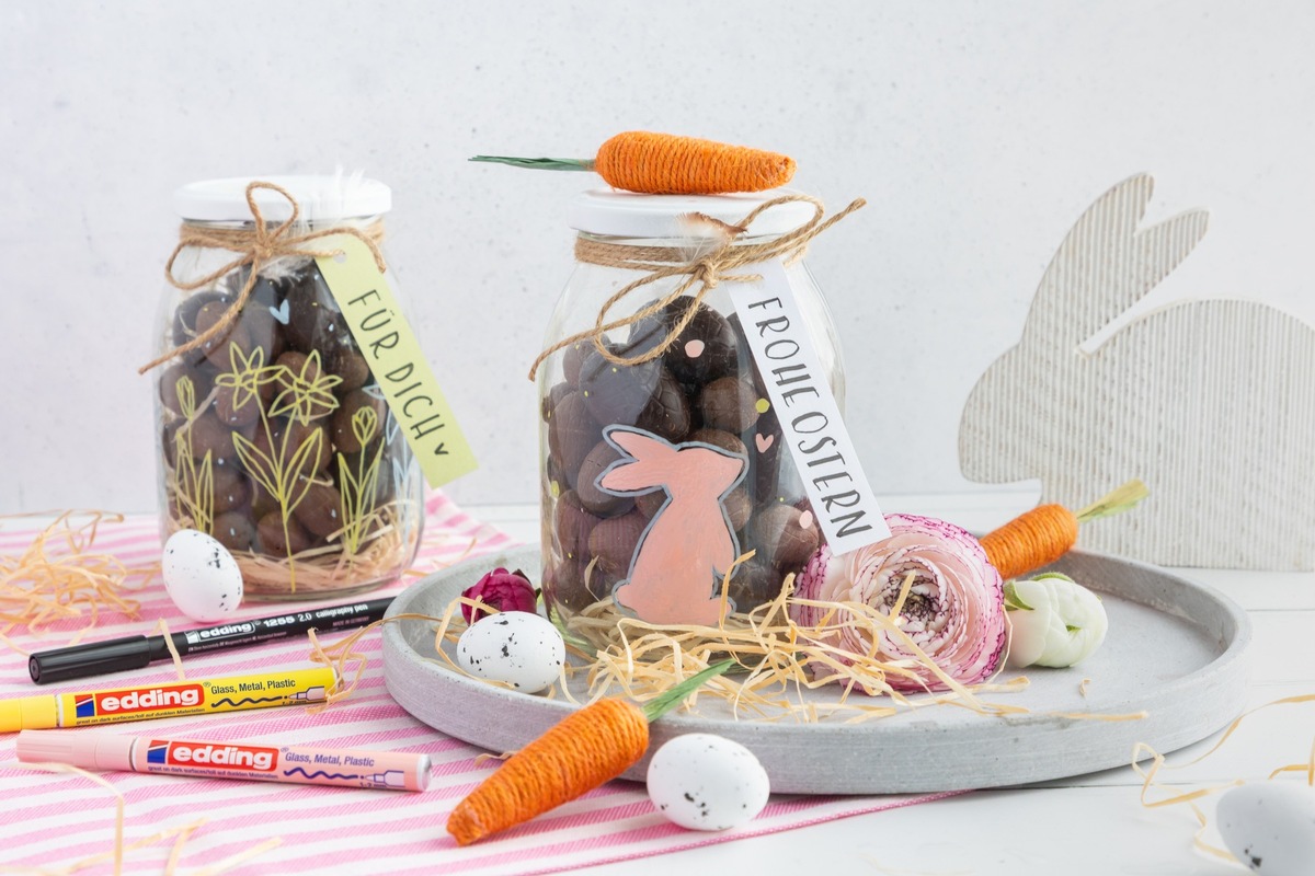 Mit diesem DIY-Ostergeschenkglas wird im Handumdrehen ein liebevoll gestaltetes Unikat gezaubert. Mit Glanzlackmarkern, Fasermalern und Kalligrafiestiften kann aus einem schlichten Glas eine farbenfrohe Überraschung werden – perfekt als kleine Aufmerksamkeit oder als dekoratives Highlight.