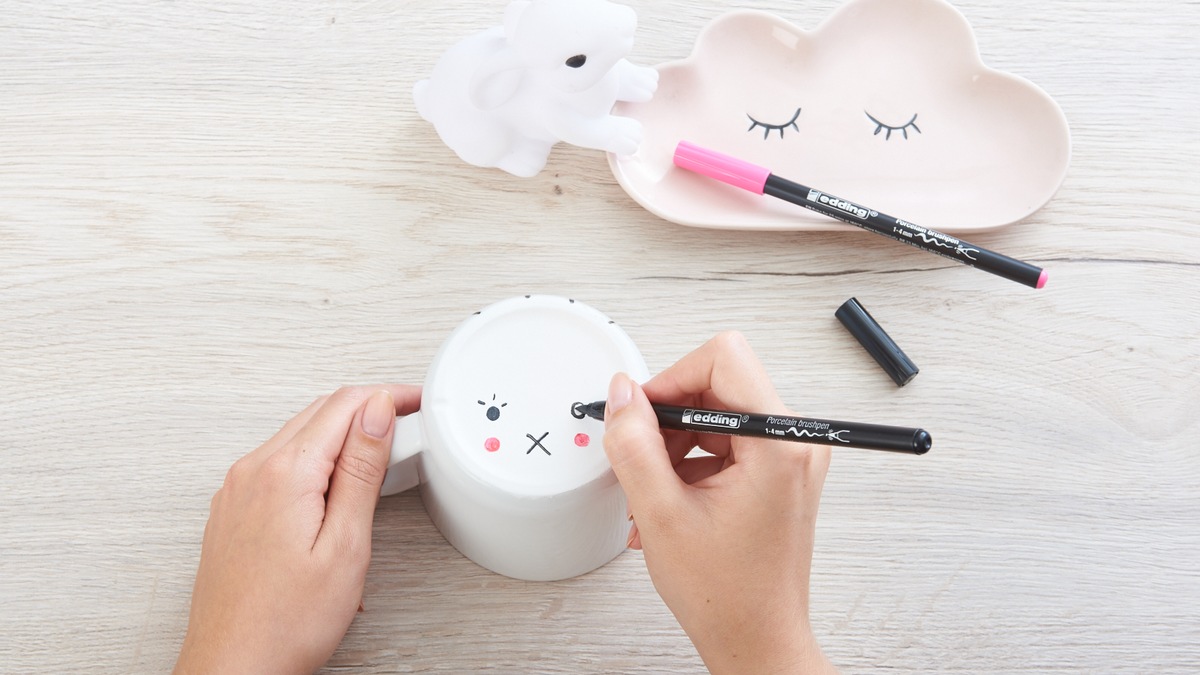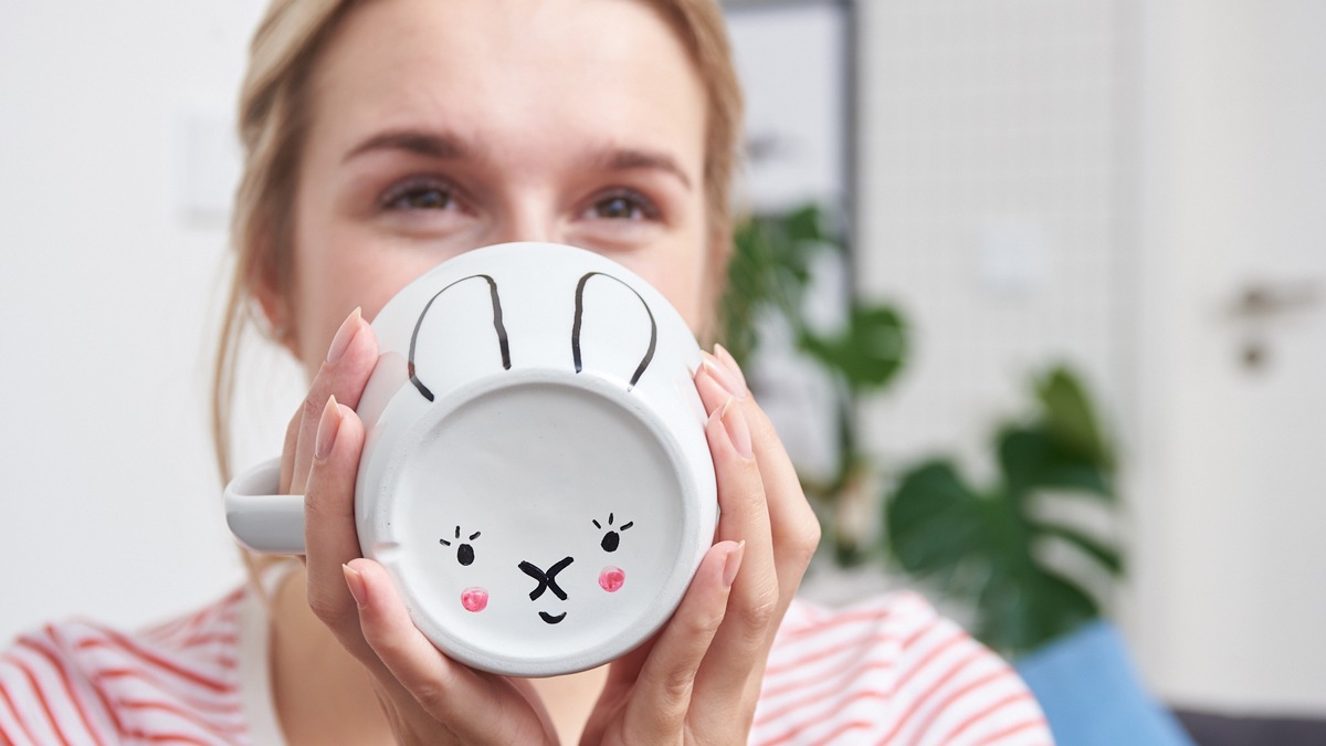 Beim Anblick dieser lustigen Hasentassen kommt auch der größte Langschläfer fröhlich an den Frühstückstisch. An der Seite der Tasse sind die langen Hasenohren zu sehen und beim Trinken kommt das süße Hasengesicht zum Vorschein, das von außen mit den edding Porzellan-Pinselstiften auf den Becherboden gezeichnet wird. Dank der weichen Pinselspitze können die Ostertassen ganz individuell in den schönsten Farben bemalt werden.