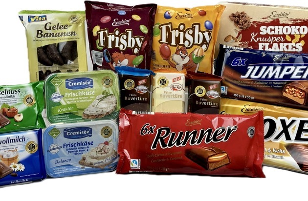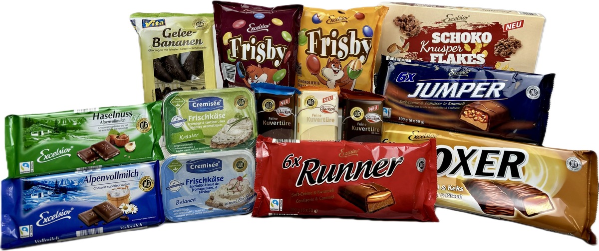 EXCELSIOR Frisby Schokolinsen / Erdnüsse 250 g / 300 g Bislang: 2,25 EUR Jetzt: 1,89 EUR EXCELSIOR Schokoladenriegel Boxer / Runner / Jumper 300 g Bislang: 2,29 EUR Jetzt: 2,19 EUR EXCELSIOR Schoko Knusper Flakes 250 g Bislang: 2,49 EUR Jetzt: 2,29 EUR EXCELSIOR Haselnuss Schokolade 100 g Bislang: 0,99 EUR Jetzt: 0,89 EUR EXCELSIOR Alpenvollmilch Schokolade 100 g Bislang: 0,99 EUR Jetzt: 0,89 EUR BONA VITA Schokolierte Geleebananen 250 g Bislang: 1,99 EUR Jetzt: 1,79 EUR BERGGOLD Gelee-Bananen 250 g Bislang: 1,99 EUR Jetzt: 1,79 EUR BERGGOLD Geleefrüchte schokoliert 250 g Bislang: 1,99 EUR Jetzt: 1,79 EUR ZAUBERHAFT BACKEN Kuvertüre verschiedene Sorten 200 g Bislang: 2,29 EUR Jetzt: 1,99 EUR CREMISÉE Frischkäse Kräuter / Nimm's leicht 300 g Bislang: 1,69 EUR Jetzt: 1,59 EUR