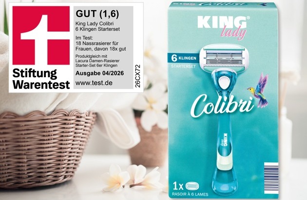 Wie gut sind Damen-Nassrasierer? Dieser Frage ist STIFTUNG WARENTEST in ihrer aktuellen Ausgabe (04/2026) nachgegangen und hat insgesamt 18 Produkte - darunter 14 Systemrasierer und 4 Einwegrasierer - aus Discountern, Drogerien und von Markenherstellern miteinander verglichen. Mit dabei: das KING LADY Colibri 6 Klingen Starterset von NORMA.