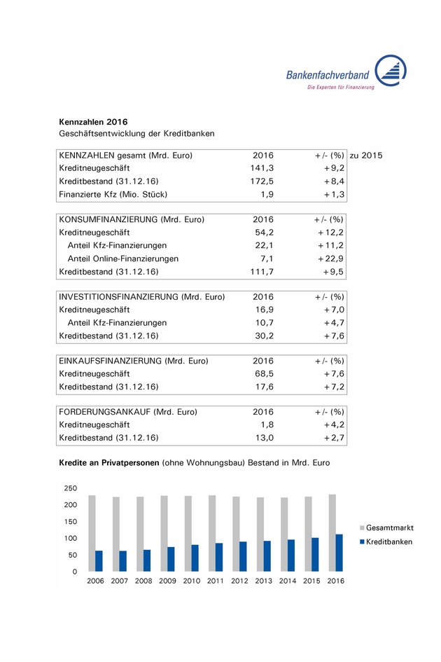 Ende 2016 lag der bundesweite Bestand an Krediten für Privatpersonen ohne Baufinanzierungen bei 231,2 Milliarden Euro. Dieser Wert ist seit über zehn Jahren stabil mit einem durchschnittlichen jährlichen Wachstum von 0,1 Prozent. "Die Privatverschuldung bewegt sich auf konstantem Niveau", erläuterte Wagner und ergänzte: "Konsumkredite werden aber zunehmend von spezialisierten Instituten vergeben". Knapp die Hälfte der privaten Finanzierungsdienstleistungen wird inzwischen von Kreditbanken erbracht. Vor zehn Jahren lag dieser Anteil bei lediglich einem Viertel.