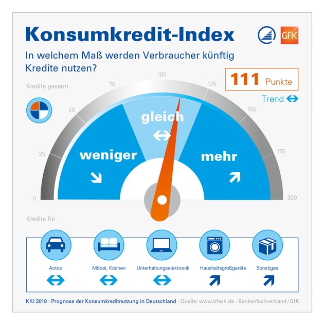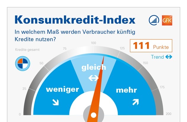 Der Konsumkredit-Index prognostiziert die Kreditaufnahme durch Verbraucher in den kommenden zwölf Monaten. Dazu befragt die GfK halbjährlich rund 2.000 Haushalte. Ein Indexwert von 75 bis 125 beschreibt eine Entwicklung auf Vorjahresniveau, über 125 steigt die Kreditnutzung signifikant an.