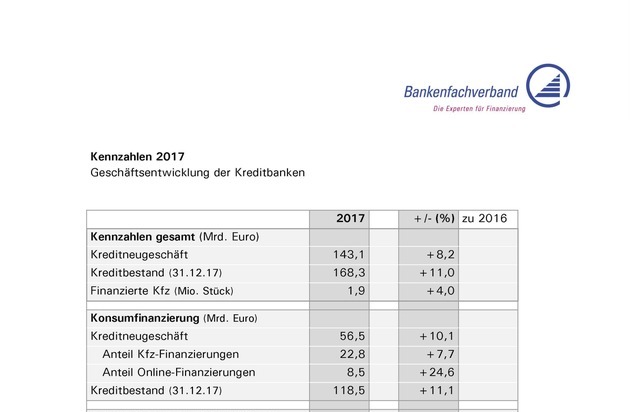 Im Jahr 2017 haben die auf die Finanzierung von Konsum- und Investitionsgütern spezialisierten Kreditbanken ihr Geschäft weiter ausgebaut. Sie vergaben neue Kredite im Wert von 56,5 Milliarden Euro an Verbraucher. Das ist ein Plus von zehn Prozent im Vergleich zum Vorjahr. Noch deutlicher weiteten die Institute ihre Kreditvergabe an Unternehmen aus. Sie stieg um 15 Prozent auf 16,5 Milliarden Euro. "Verbraucher und Unternehmen haben verstärkt in Konsum- bzw. Investitionsgüter investiert und diese finanziert", sagte Jan W. Wagner, Vorstandsvorsitzender des Bankenfachverbandes, vor Medienvertretern in Frankfurt und erläuterte: "Die historisch niedrigen Arbeitslosenzahlen wirken sich positiv auf das Konsumklima aus und die gute Konjunktur befördert die gewerblichen Ausrüstungsinvestitionen." Insgesamt finanzierten die Kreditbanken 1,9 Millionen Kraftfahrzeuge per Kredit und damit vier Prozent mehr als noch ein Jahr zuvor.