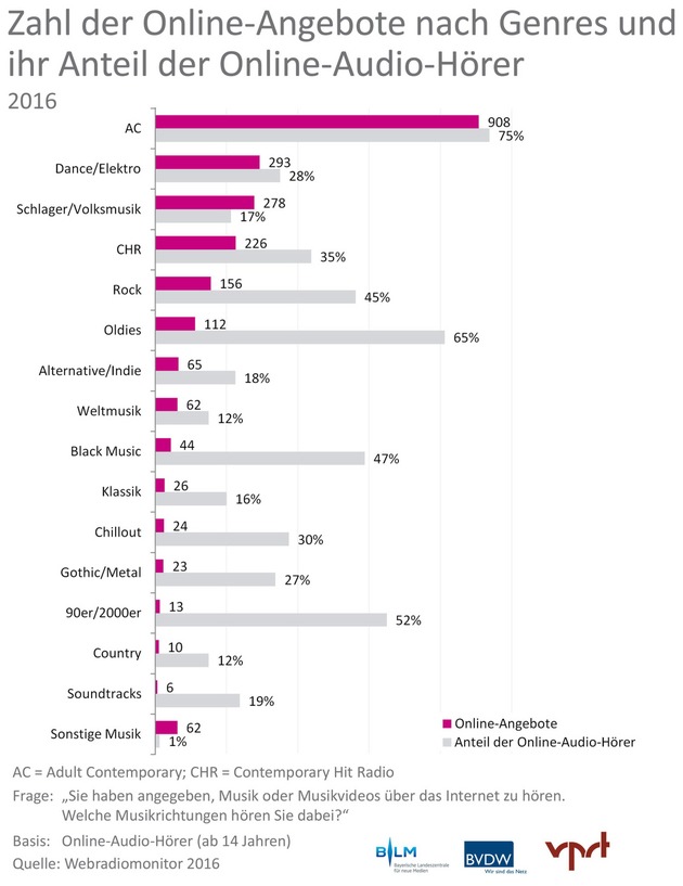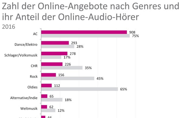 Aktuell wurden 10.139 Online-Audioangebote in Deutschland gezählt, davon 7.686 User Generated Radiostreams oder kuratierte Playlists und 2.453 Webradio-Angebote. 53 Prozent der untersuchten Webradio-Angebote bieten Formate für spezielle Zielgruppen und Musikrichtungen, 47 Prozent eher klassische Radioformate für breitere Zielgruppen.