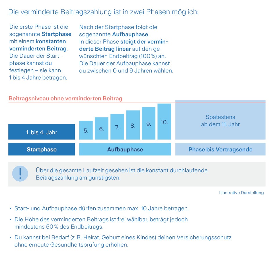 Die neue Berufsunfähigkeitsversicherung kombiniert eine Start- und Aufbauphase mit einer stufenweisen Beitragsanhebung über mehrere Jahre. Die Startphase zeichnet sich durch konstant niedrige Beiträge aus und kann flexibel zwischen einem und vier Jahren gewählt werden. Die Höhe des verminderten Startbeitrags ist frei wählbar, beträgt jedoch mindestens 50 Prozent [1] des späteren Endbeitrags. Daran schließt sich eine Aufbauphase mit jährlich linear steigenden Beiträgen an, die bis zu neun Jahre dauern kann. Insgesamt sind Start- und Aufbaubeiträge für eine Dauer von bis zu zehn Jahren möglich. Der Versicherungsschutz besteht von Anfang an in voller Höhe.